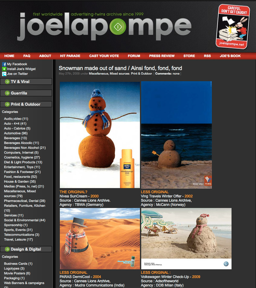 j'adore ce site, si vous voulez allez jeter un oeil c'est là, Joe la pompe s'évertue à nous démontrer que l'acte de création publicitaire est souvent issu d'une pompe, comme à l'école, l'élève un peu faignant qui copie, qui louche, qui lorgne sur son voisin... alors quoi de plus simple que d'aller s'inspirer à l'étranger et de reprendre mot à mot un slogan et/ou une image et d'aller le revendre très, très cher à un très gros client....